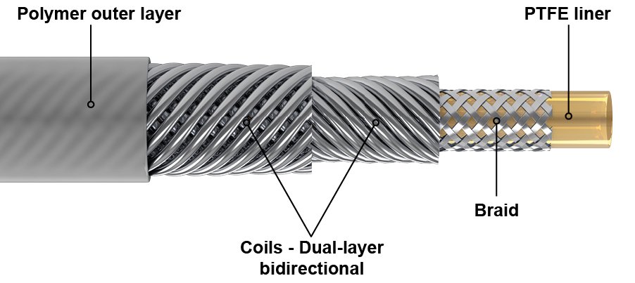 - Dual-layer bidirectional coils facilitate torque transmission when rotating the catheter in both a clockwise and counterclockwise fashion